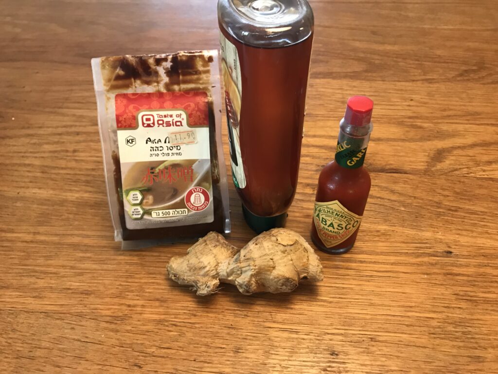 – 2-4 ס”מ של מיסו בעובי של אצבע בערך. מי שלא מכיר – את המיסו רוכשים בחנויות הטבע. מרקם כמו פלסטלינה. יש סוג כהה, וסוג בהיר. אני משתמש בכהה בעיקר.